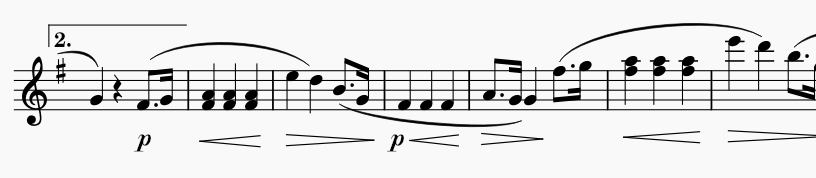 2小節のまとまりでクレッシェンド、ディクレッシェンドが書かれています。