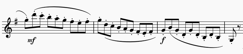 はじめの4小節は、スタッカートとスラーの両方が書かれています。