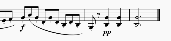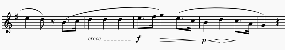 はじめの4小節はピアノ(p)。5小節目にクレッシェンドがあり、6小節目にフォルテ(f)がついてデクレッシェンドになる。