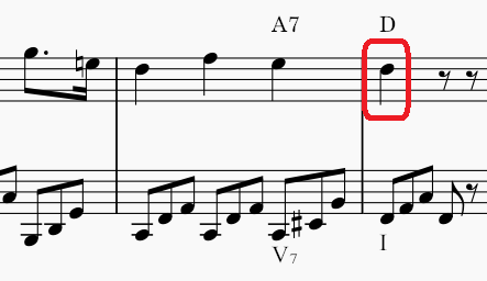 そして、ニ長調のⅤ₇-Ⅰ(A₇-D)。