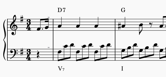 2小節のまとまりは、まずト長調で、Ⅴ₇-Ⅰの進行になっています。