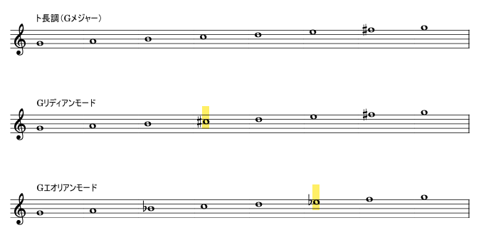 それぞれの音の並びを以下に載せます。黄色の印は、そのモードの特徴音です。