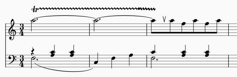 2小節にわたるトリル、と書きましたが、厳密にいうとこのトリルは3小節目の頭まで続いています。