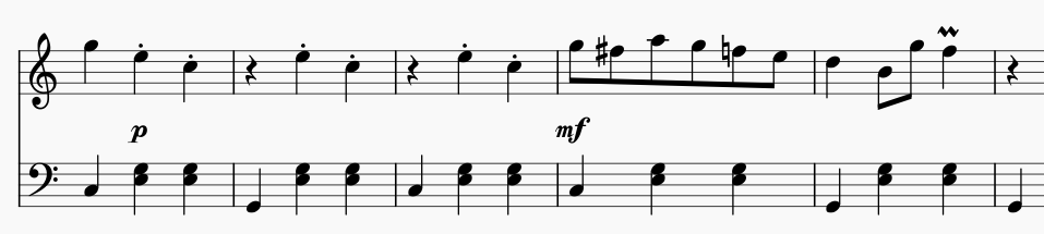 強弱を見てみると、「かっこう かっこう」という「ミ↘ド ミ↘ド」の部分はpになっています。